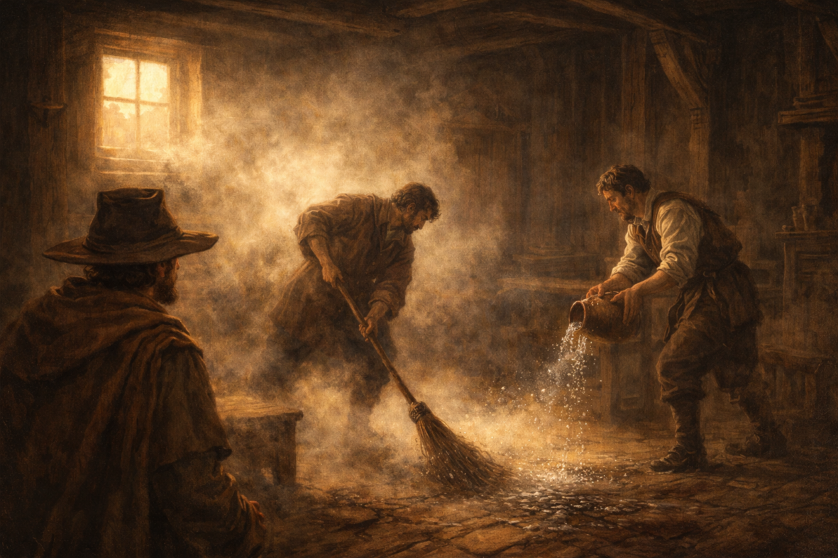 But the more he sweeps, the worse it becomes. The dust rises into the air until no one in the room can breathe. Instead of fixing the problem, the sweeping makes the whole place almost unlivable.
