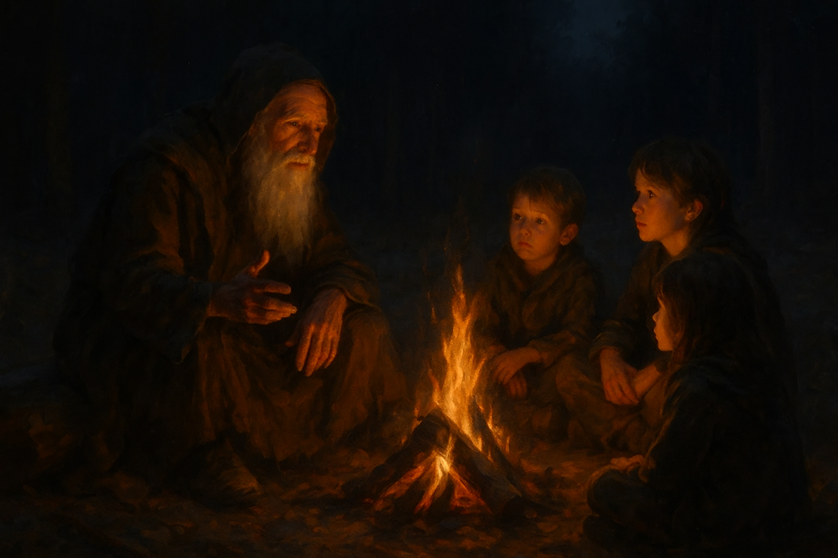 The fire burns steady, but the shadows feel thicker around the circle, as if the world itself is holding its breath. The old man sits quietly for a long moment, staring into the flames. The children wait. They have learned that when his silence lingers, the story he carries is heavy.